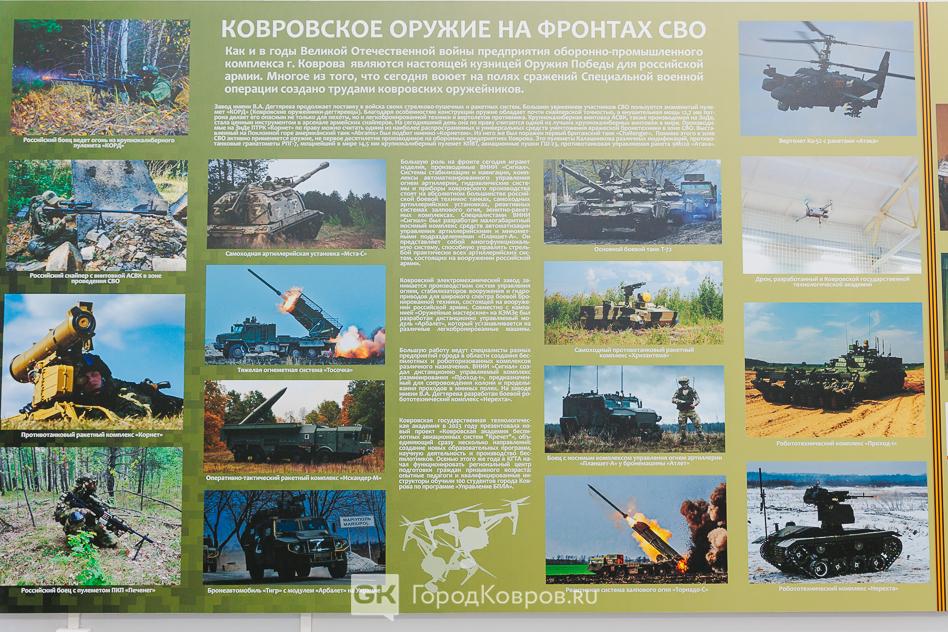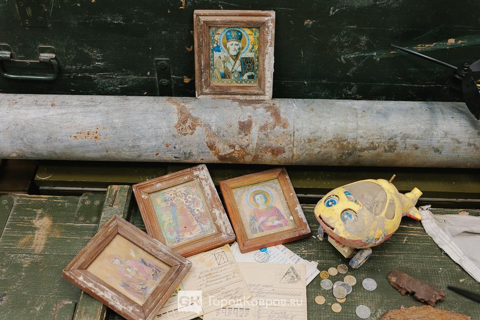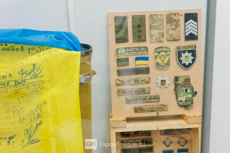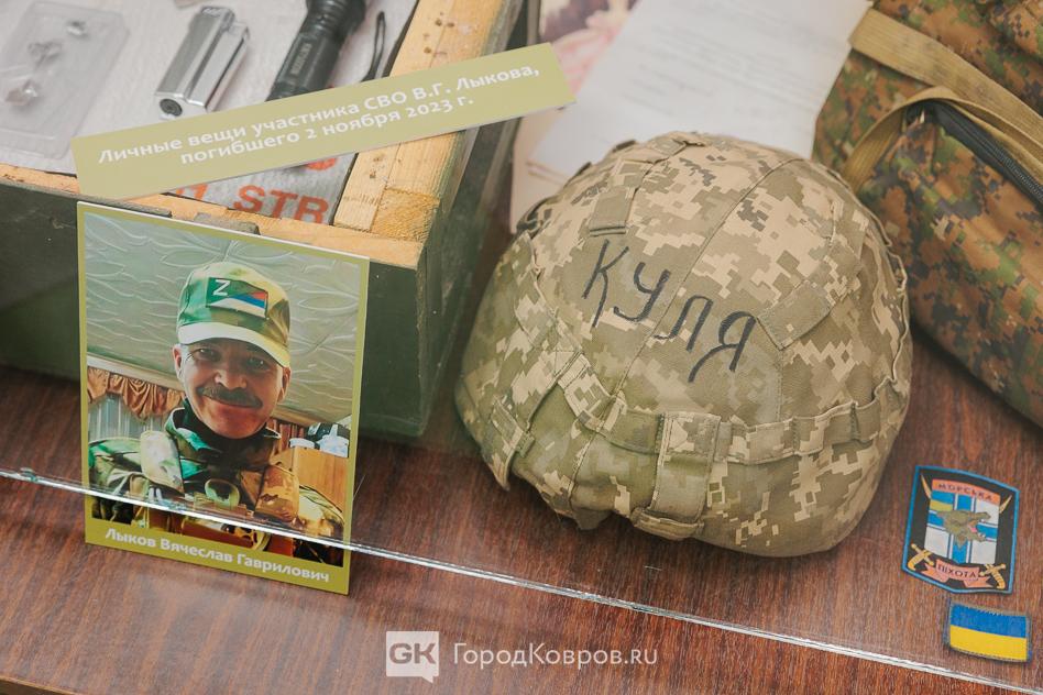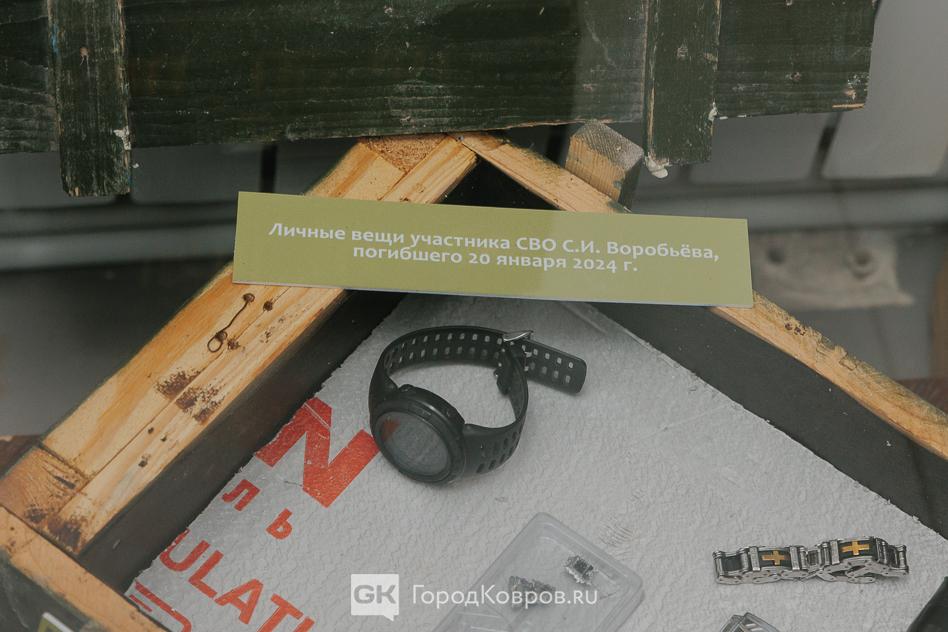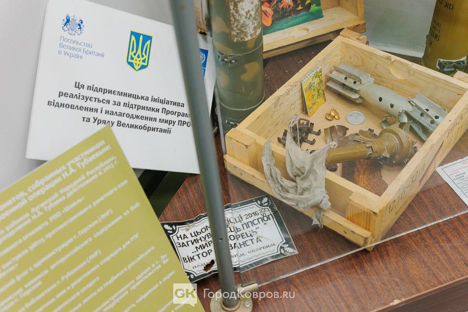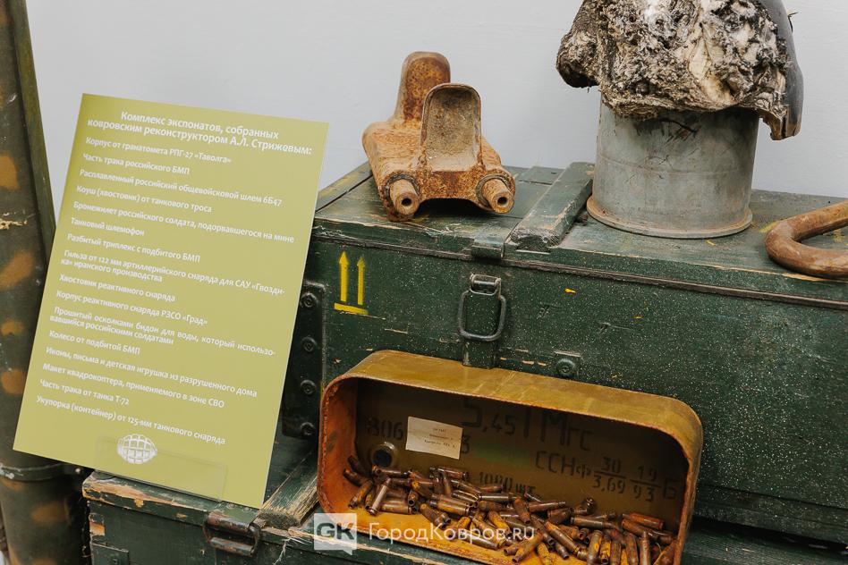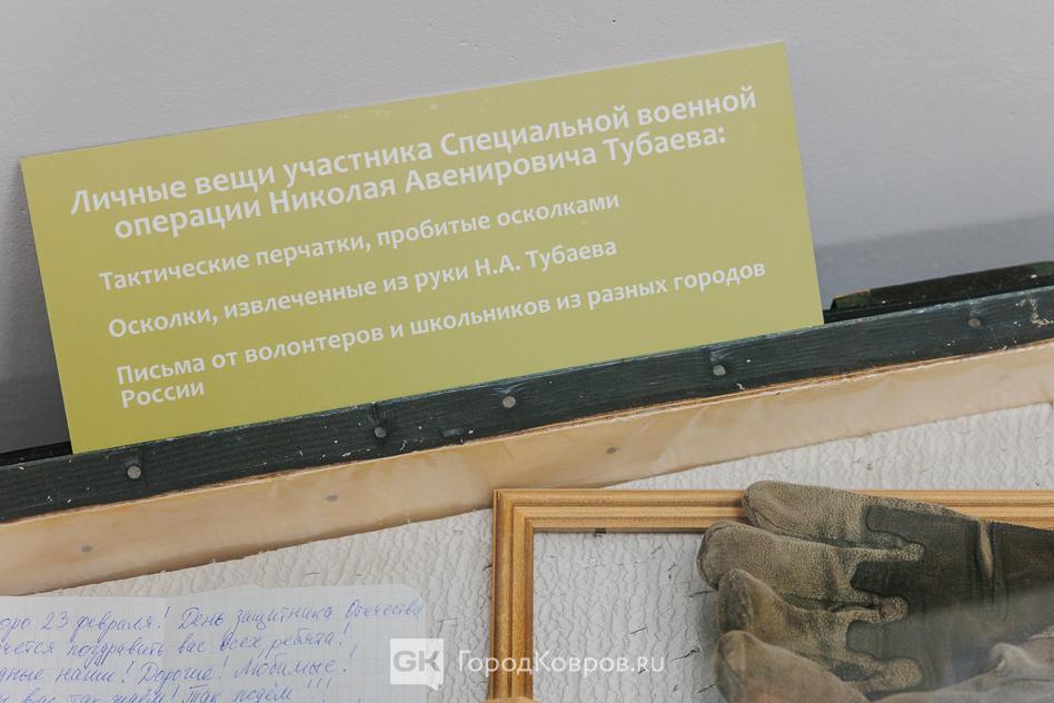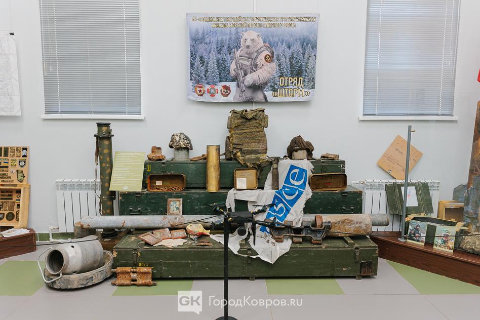 Всё это привезли бойцы из зоны СВО, наши земляки. Сбором и подбором экспонатов заведовал известный в Коврове коллекционер и реконструктор Николай Тубаев. Он сейчас воюет в зоне СВО, в музее от него фото и тактические перчатки.
