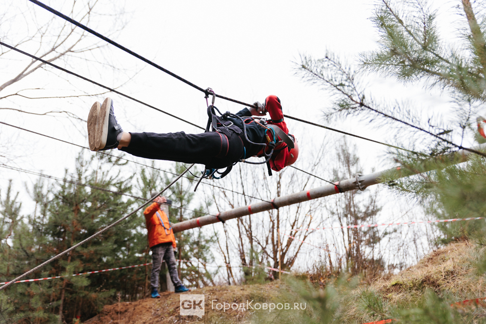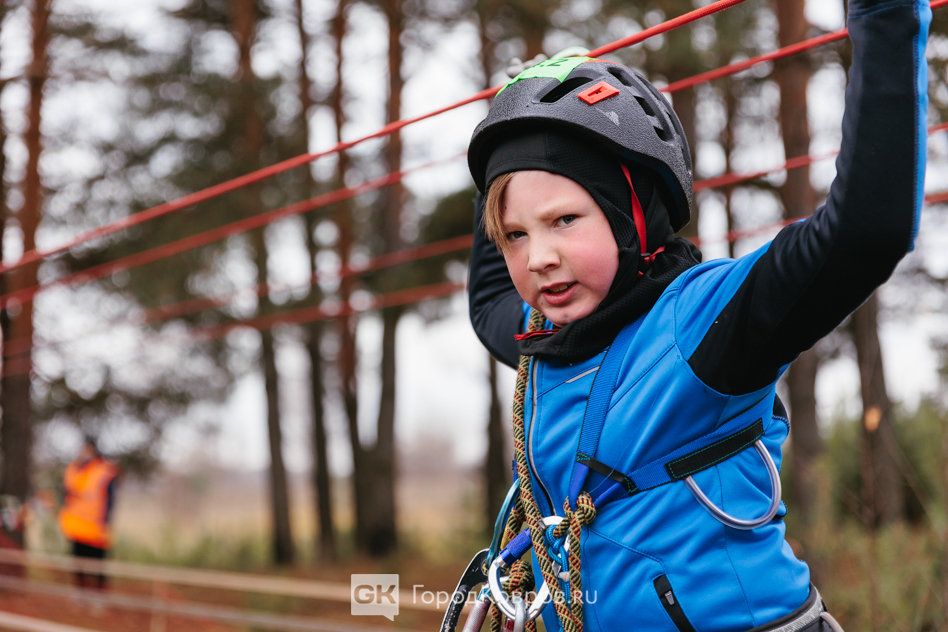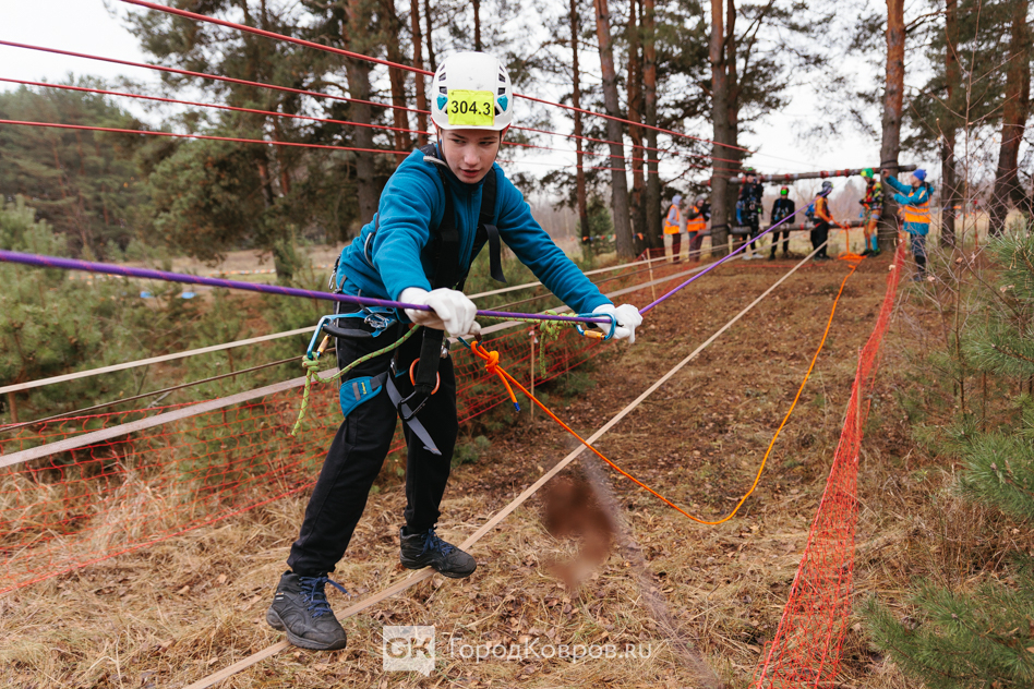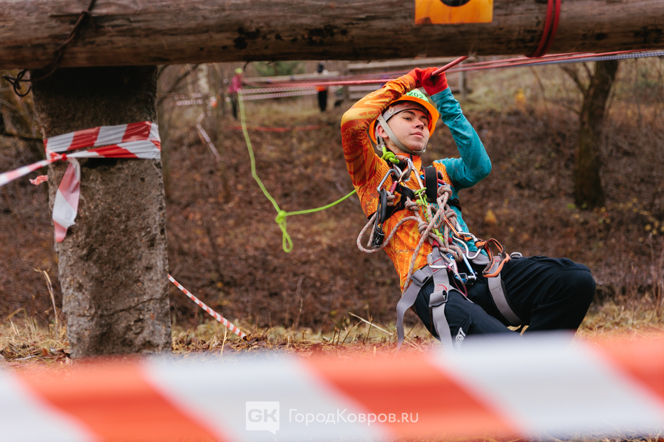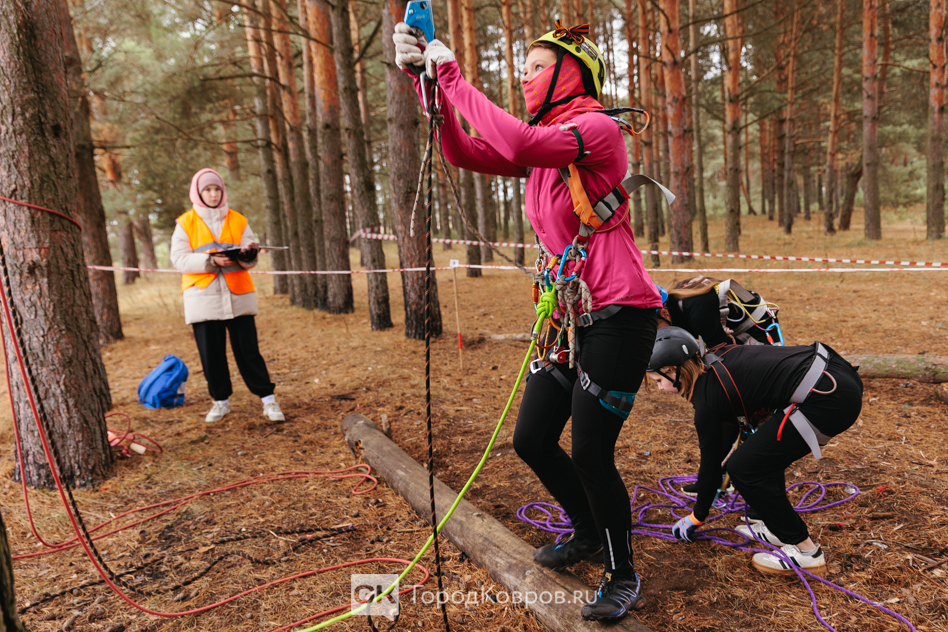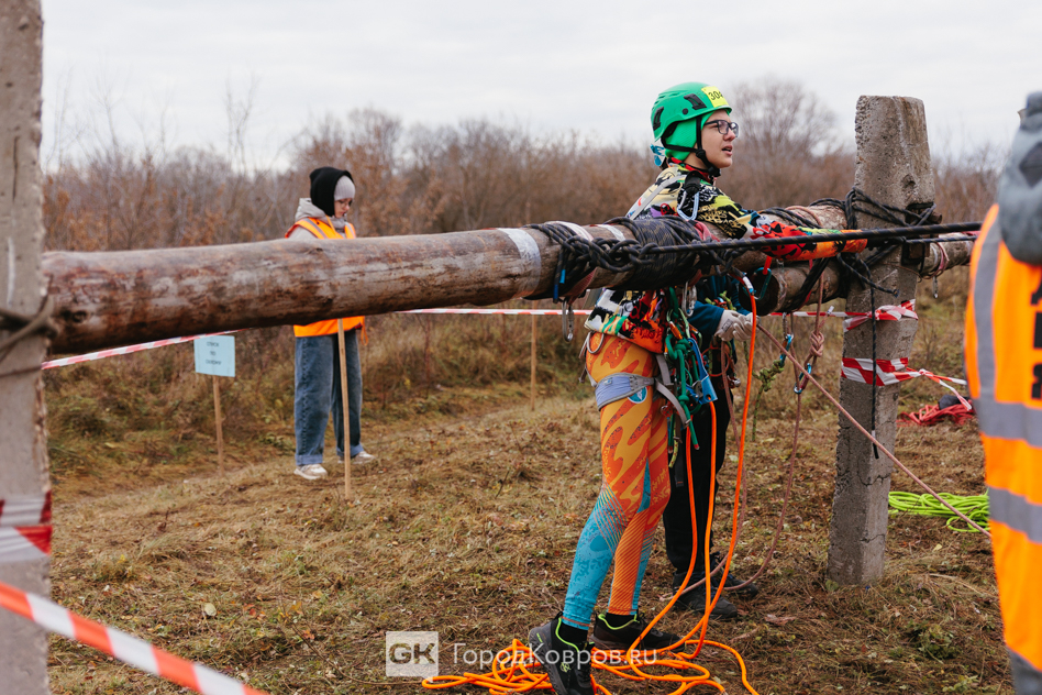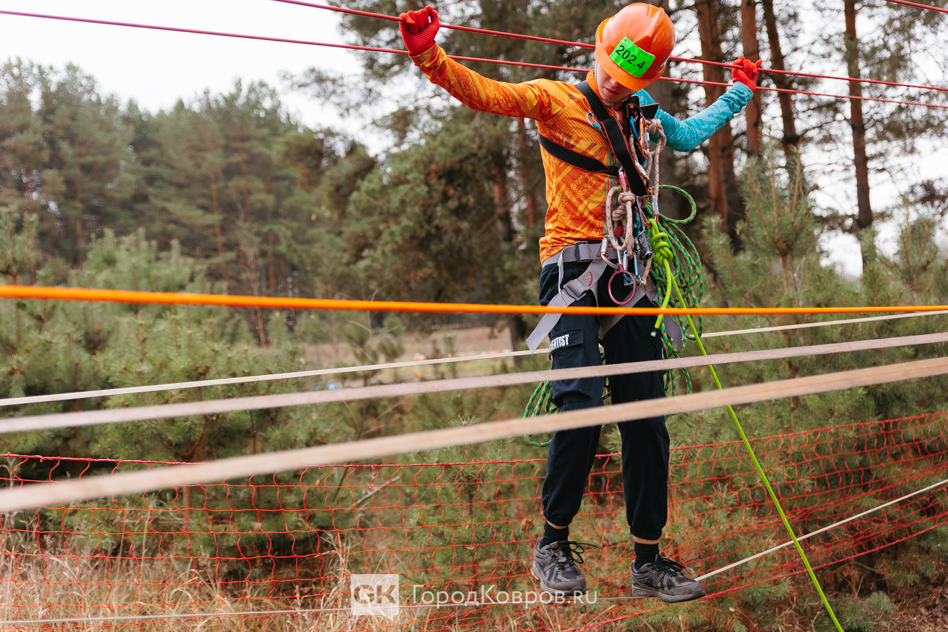 Следующий этап требовал особой ловкости и выносливости. Спортсмены в каске и страховочной системе готовятся к старту: проверяют карабины и оценивают дистанцию.
