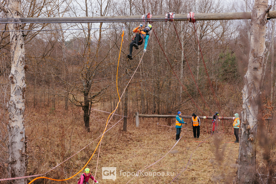 Участники пересекают овраг по навесной переправе, держась за верёвку и опираясь на страховочные карабины. Судьи наблюдают за прохождением этапа.
